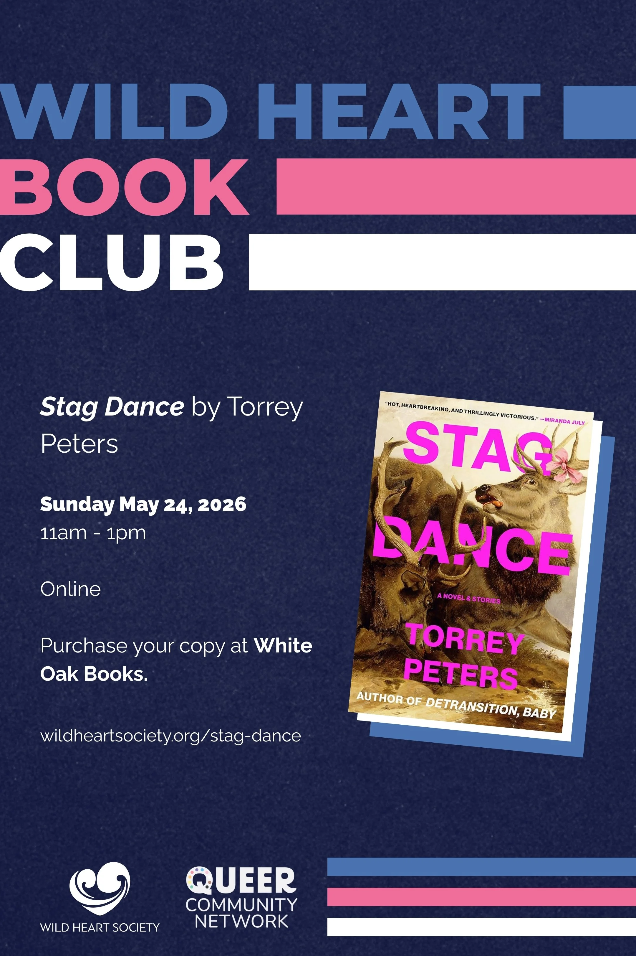 Join Wild Heart Society and Queer Community Network for a meeting of Wild Heart Book Club featuring Stag Dance by Torrey Peters. This gathering invites queer, trans, and allied adults to come together for thoughtful conversation, shared reflection, and community connection. No academic vibes, no pressure to be “caught up.”