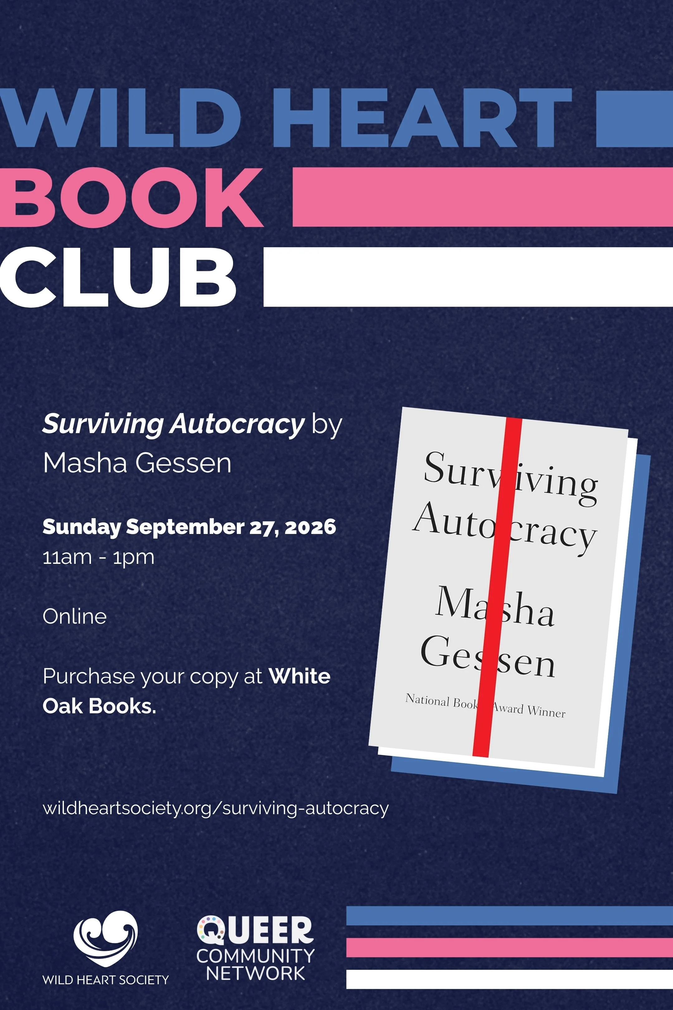 Join Wild Heart Society and Queer Community Network for a meeting of Wild Heart Book Club featuring Surviving Autocracy by Masha Gessen. This gathering invites queer, trans, and allied adults to come together for thoughtful conversation, shared reflection, and community connection. No academic vibes, no pressure to be “caught up.”