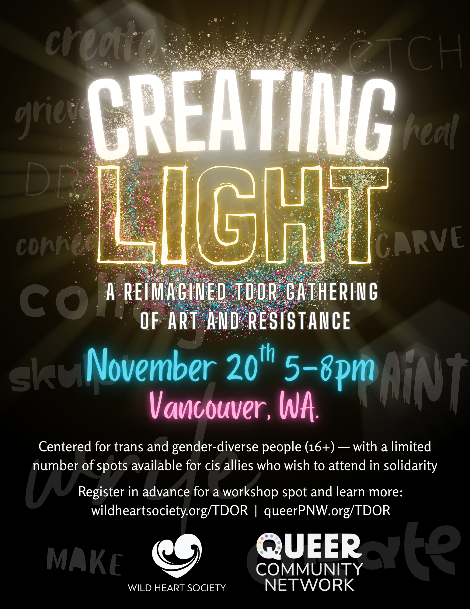 Join us for a reimagined Trans Day of Remembrance that honors our lost loved ones through art, memory, and connection. Take part in guided workshops like watercolor, collage, and creative writing, or enjoy open studio stations with button making, rock painting, and more.